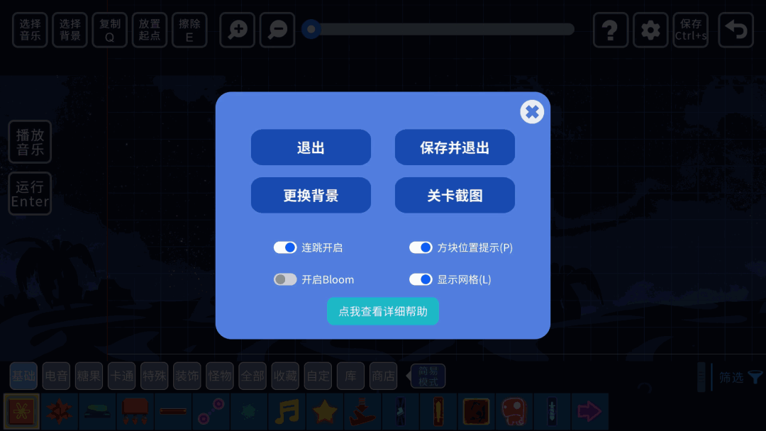 【设置】按钮。这里包含保存,保存并退出,更换背景(同上),关卡截图(便于其他玩家预览你的关卡),开启/关闭连跳,开启/关闭方块位置提示,开启/关闭Bloom,开启/关闭显示网格等功能。