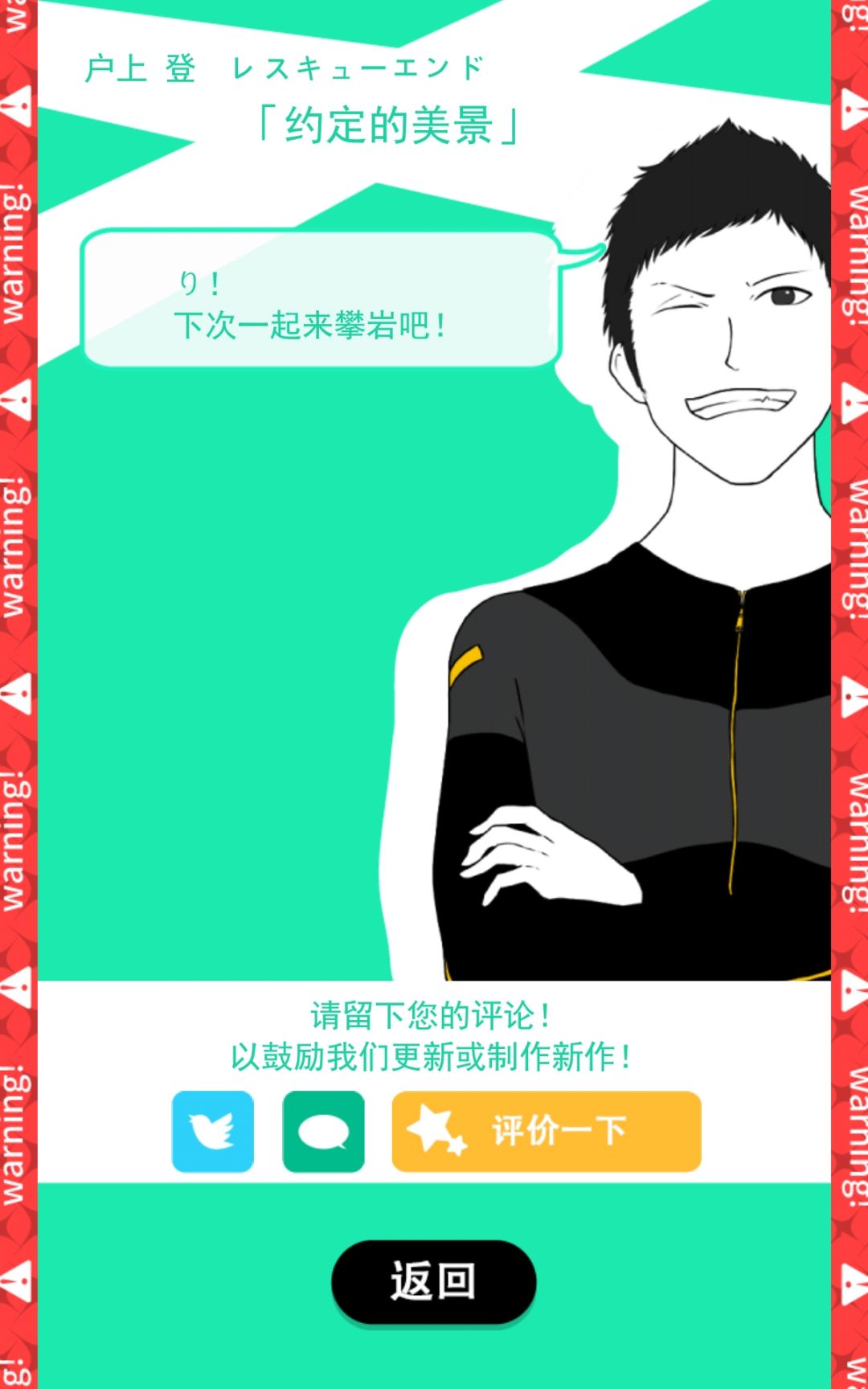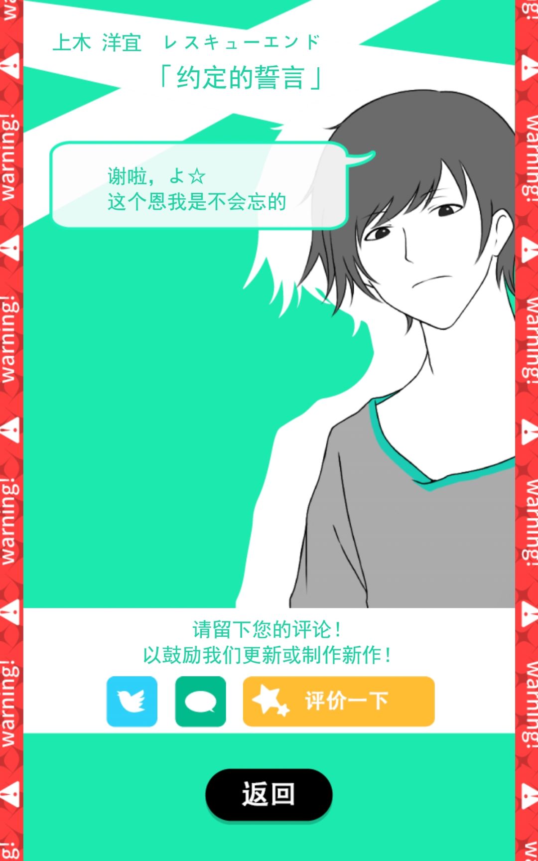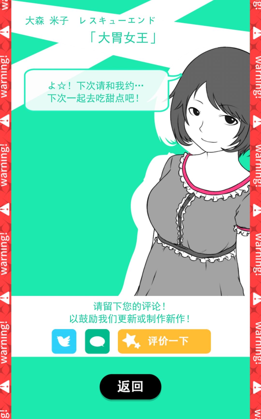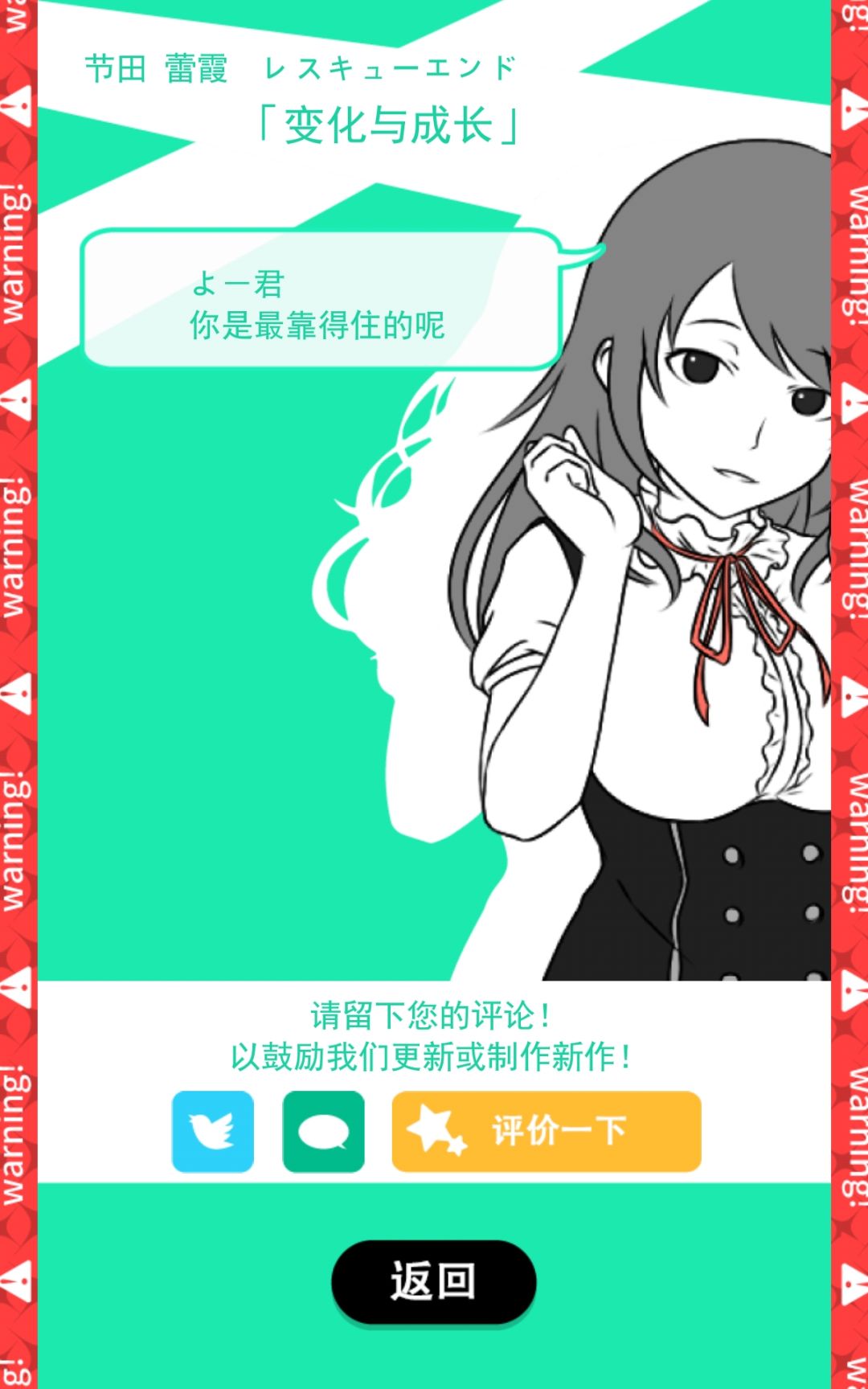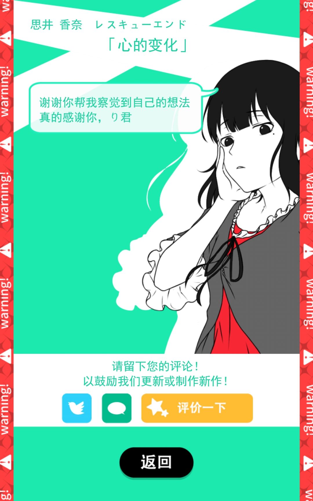非常胆小的姑娘获得勇气的故事,全游戏最危险的一条线,总共有三个危险点,第一个下车be和第三个报警be,没有勇气试第二个了orz第二个满点的