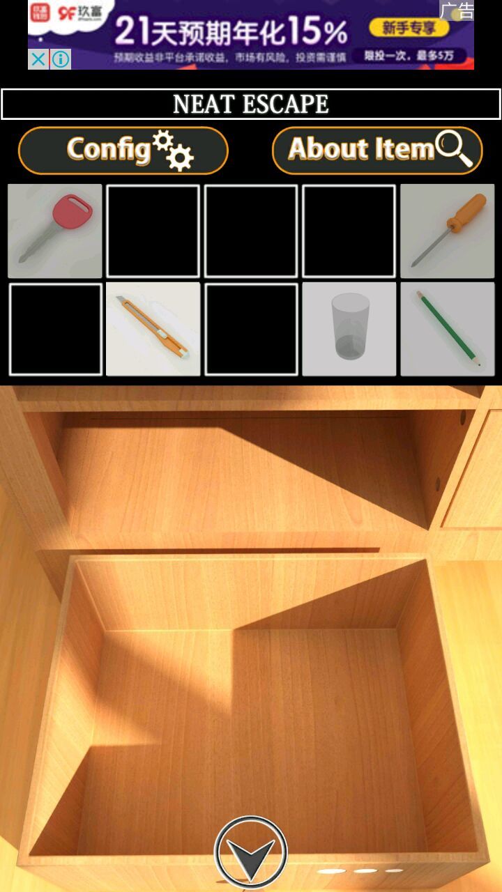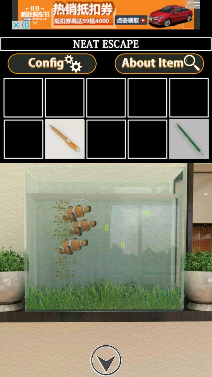 首先,先点桌子,拿桌上笔筒里的笔,后退,点落地窗再点其出去拿空调外机右下角角落拿裁刀,后退点落地窗左边出去,用裁刀打开箱子得鱼饵,放大铅笔画面对它用刀得削过的铅笔,一直后退直到画面转向室内另一面,图1