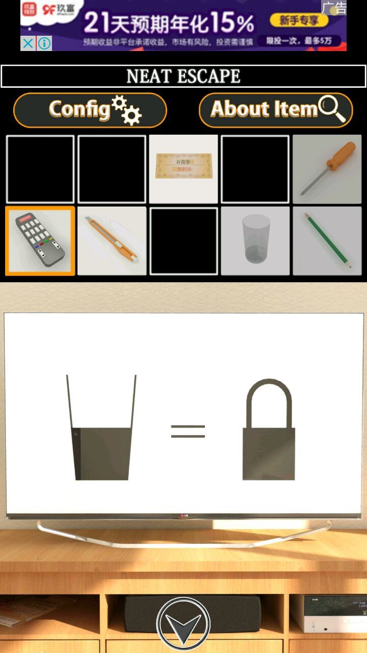 把右边两个螺丝用螺丝刀拧掉,就可以打开中间抽屉得杯子了。 后退到室内另一面,点大门一下再点左边墙上的门进入浴室,先拿浴缸里的电池,再后退点镜子用螺丝刀拧掉螺丝打开得黄钥匙,退出浴室点右边门,用红钥匙开门点最下排盒子拿遥控器(没电池)。后退点大门画面再点右边鞋柜对箱子用笔记本桌上纸的提示,打开得一张食物券。(不拿到最后出去则是普通结局) 后退回初始画面点床再点床底拉出箱子用黄钥匙打开得第二块电池,点遥控器放大画面翻到背面装上电池,再去对电视机使用得提示,如图5