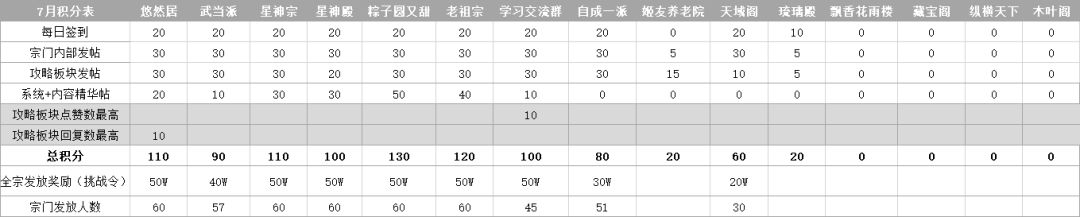 感谢大家本月的支持和参与,7月的宗门板块积分情况整理如下: