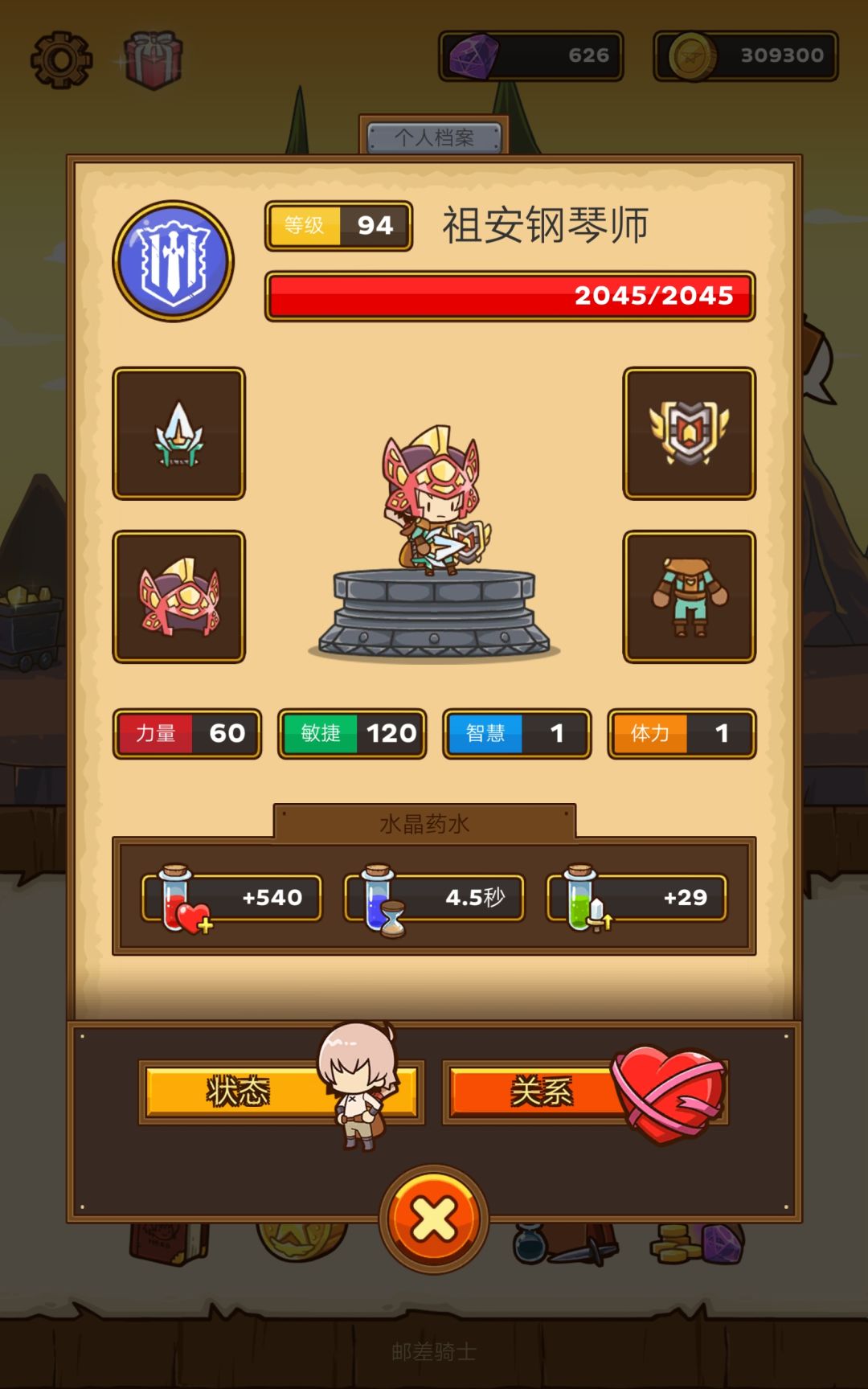 组合四 (追求极致输出,敏捷100/剩余全力量,闪避盾/闪避盾,伤害数字确比上面还好看,不过弊端也明显,不注意磕药容易挂。)