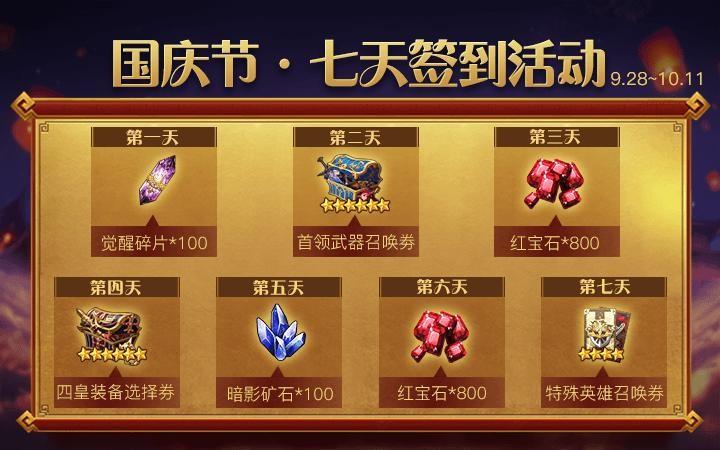 欢度十一,豪礼不断。国庆节活动期间,骑士们每天都可以签到领取奖励,首日即可领取“觉醒碎片*100”礼品,连续签到七天还可解锁四星特殊英雄召唤券!在这个普天同庆的节日里让我们相约艾伊莎大陆,把节日的祝福分享给所有骑士!