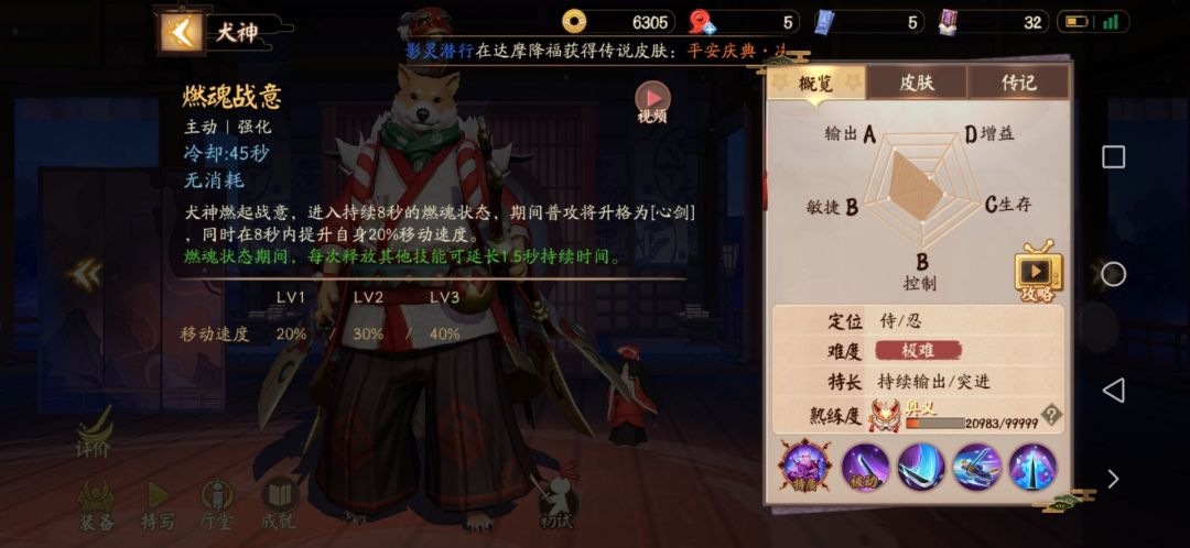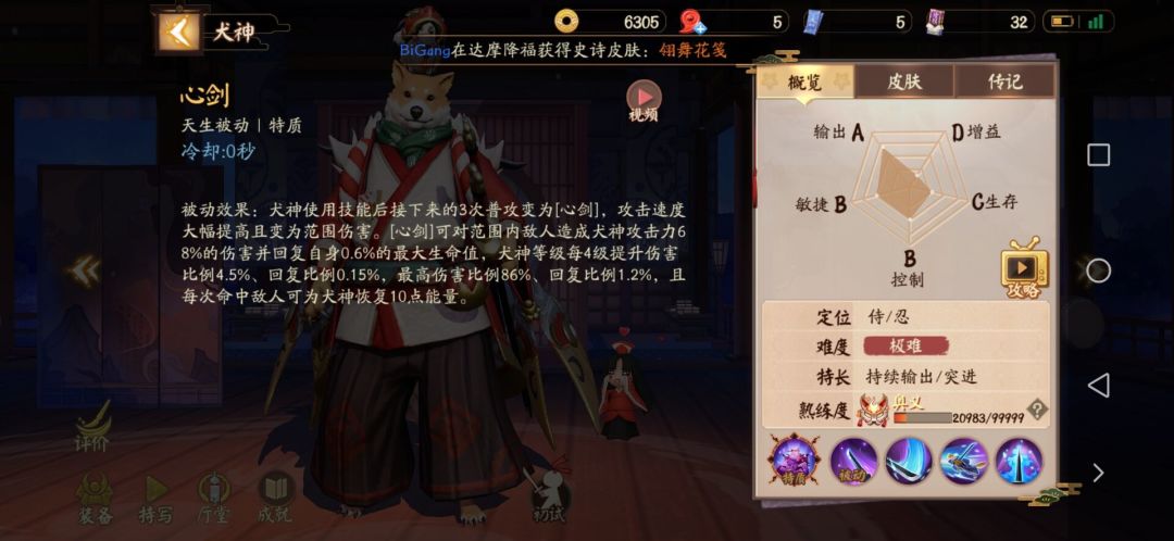 被动效果:犬神使用技能后接下来的3次普攻变为[心剑],攻击速度大幅提高且变为范围伤害。[心剑]可对范围内敌人造成犬神攻击力68%的伤害并回复自身0.6%的最大生命值,犬神等级每4级提升伤害比例4.5%、回复比例0.15%,最高伤害比例86%、回复比例1.2%,且每次命中敌人可为犬神恢复10点能量。