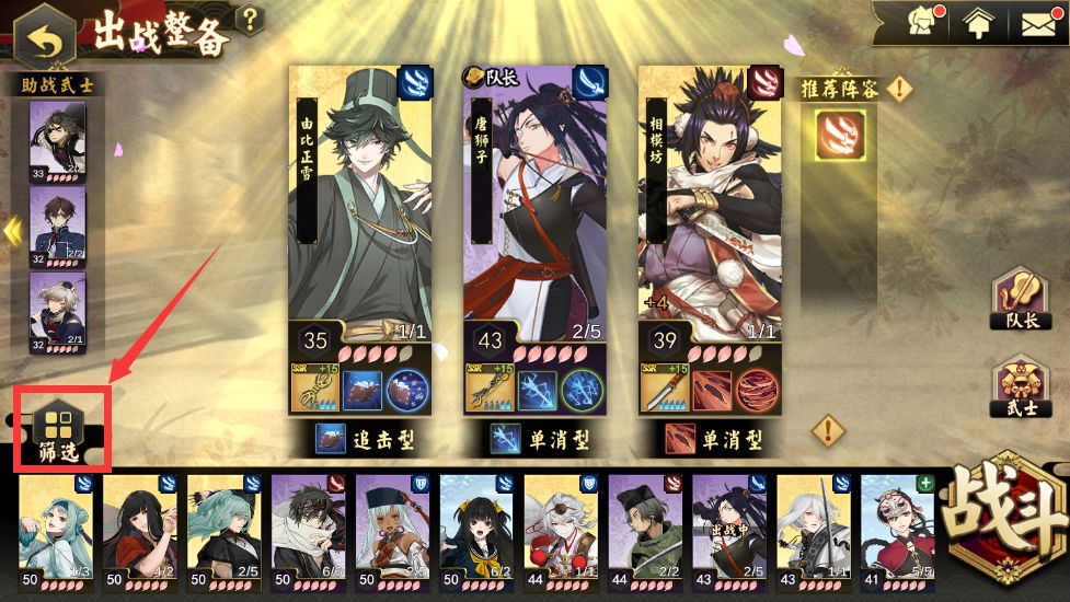 在进入副本后都会有一个选择武士的界面,如图红色箭头