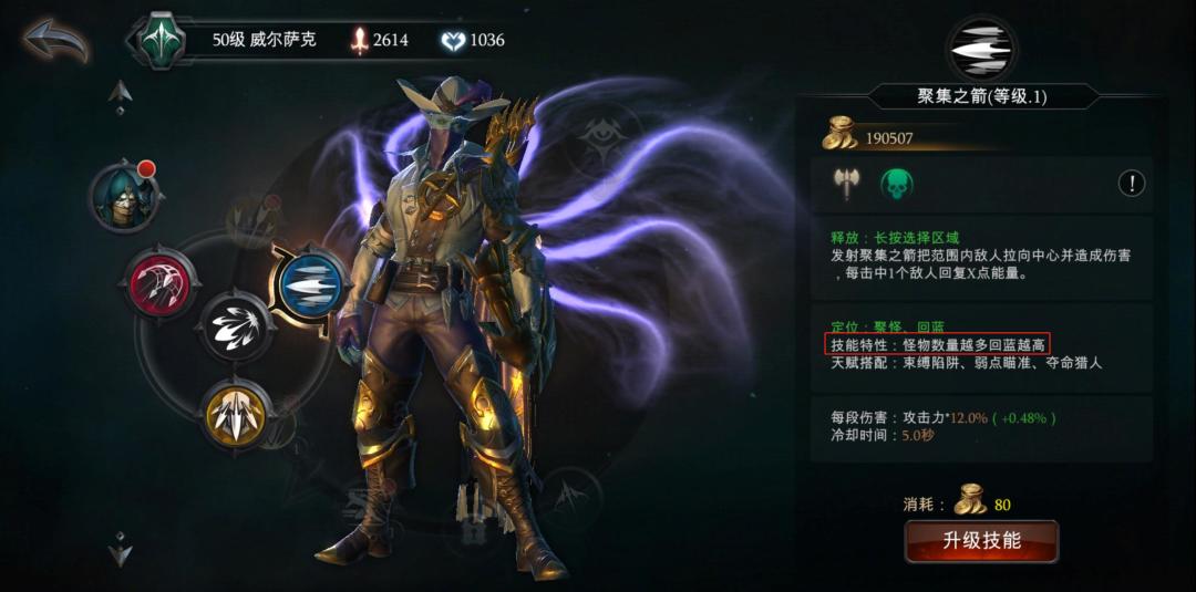将技能“聚能之箭”调整为:发射聚集之箭把范围内敌人拉向中心并造成伤害,每击中1个敌人回复X点能量;