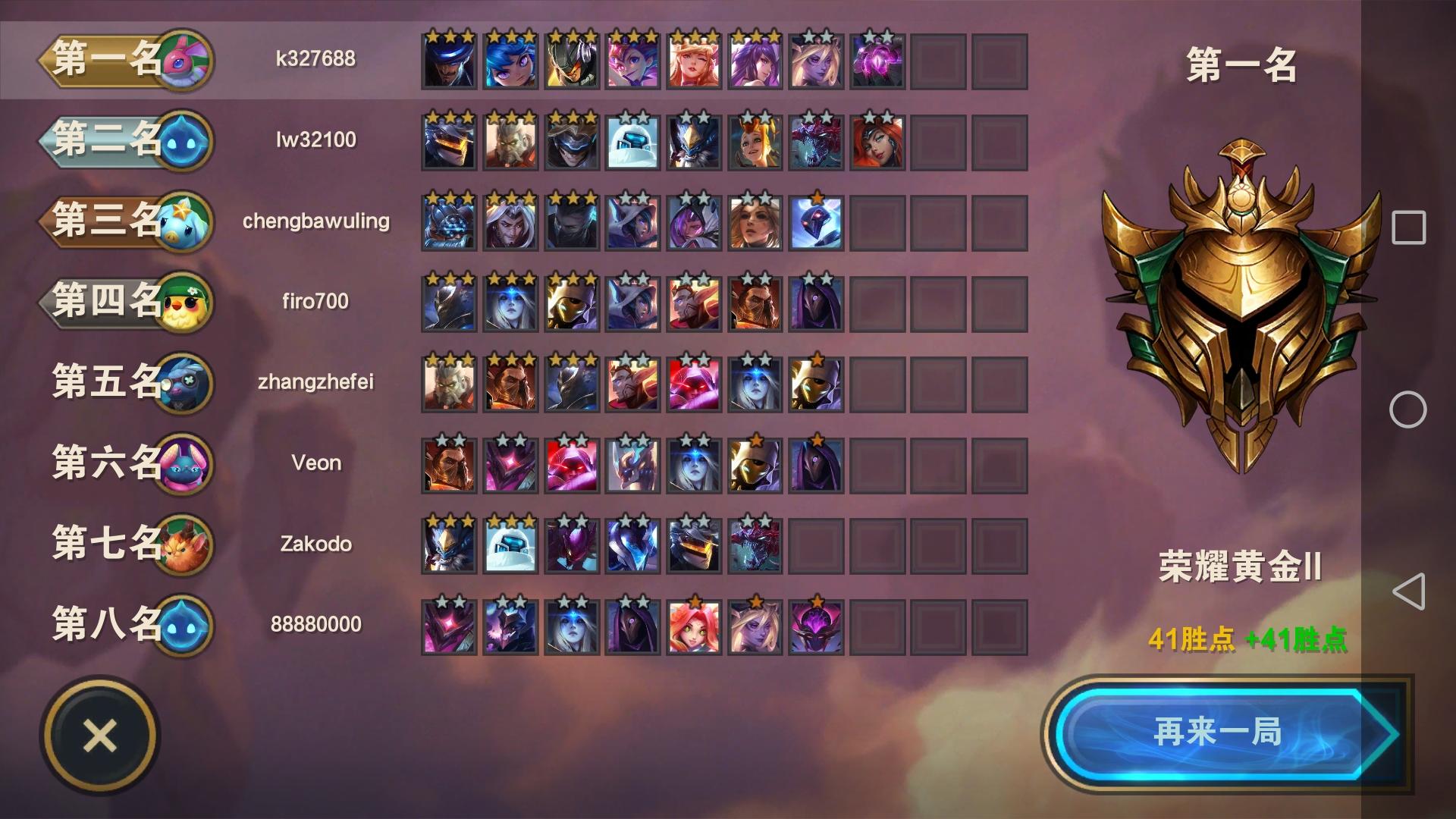 哇咔咔(´∀`*)~金色传说!!!前期就很顺,合了两三个三星,虽然是低费卡,不过连胜吃利息不在话下!不美的是波比的装备差了点,到最后也是一件半+一个多了没处放的救赎