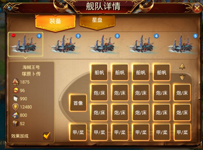 船只装备共有六类:船首像,火炮,甲板,船帆,船桨,吊床