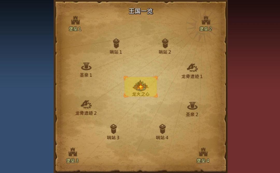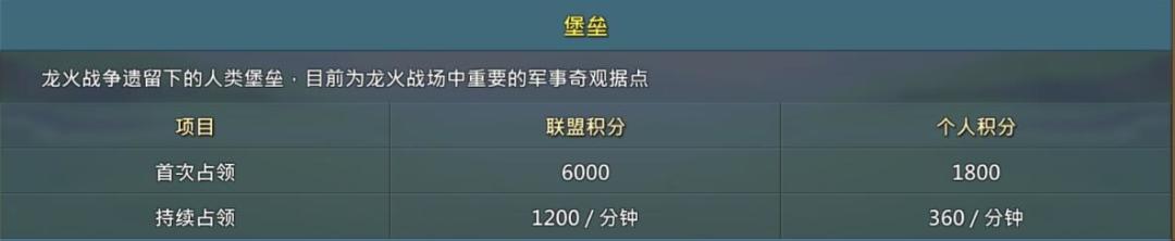 2.战场中的奇观据点有哨塔、传送阵、圣泉、龙骨遗迹、堡垒等等 ,各有不同的积分和效果,随着战场进行时间开放夺取。战场中心为龙火之心,此建筑为龙晶车队的出发点,无法被夺取;