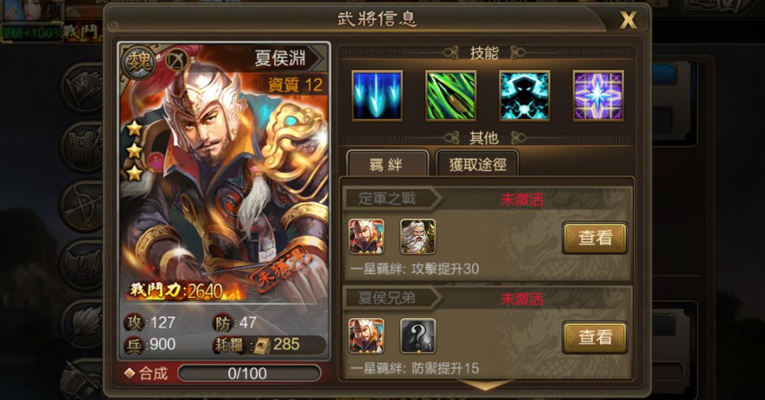 在《將膽》中職業為「弓兵」的夏侯淵,就像手中百步穿楊的弓箭一樣,是一位善於奇襲的人物。絕技「秋風掃葉」能射出多發箭矢,隨機對敵人造成重創,並有機率使目標中毒、沉默,減益效果什麼的最讓敵人頭痛了!此外,夏侯淵出陣時,可讓距離一格內的友軍提升暴擊值,攻擊更有效率!