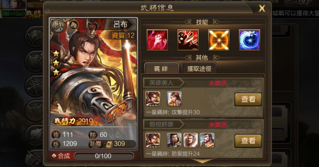 驍勇善戰的呂布,在大家的印象中一直都是戰神般的傳說,有「人中呂布,馬中赤兔」的美名。身為三國傳奇戰神,當然也有相應的破壞力,技能「鬼神泣」能直接對全體敵人造成大量傷害,並使對手降防;經過訓練後,每次攻擊都有機率對三格內的目標同時造成傷害!對敵軍來說,就是一種掃到颱風尾的感覺啊……