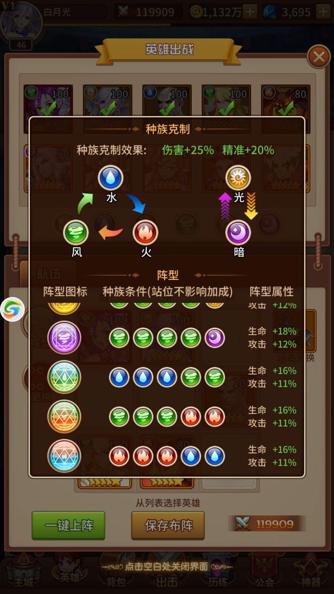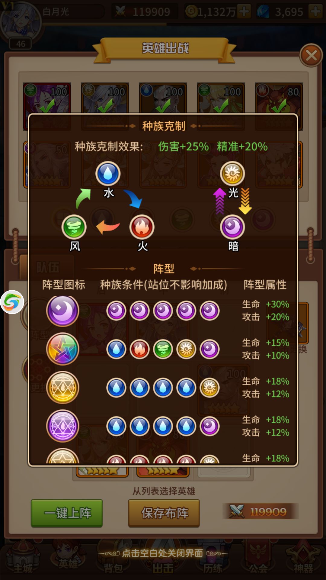 不同的属性的英雄组成的阵容属性加成不一,大家可以根据自己想要玩的阵容进行英雄组队。