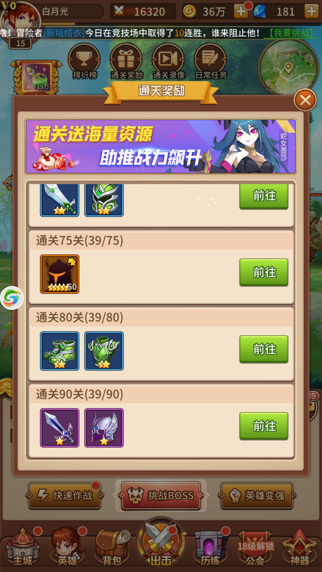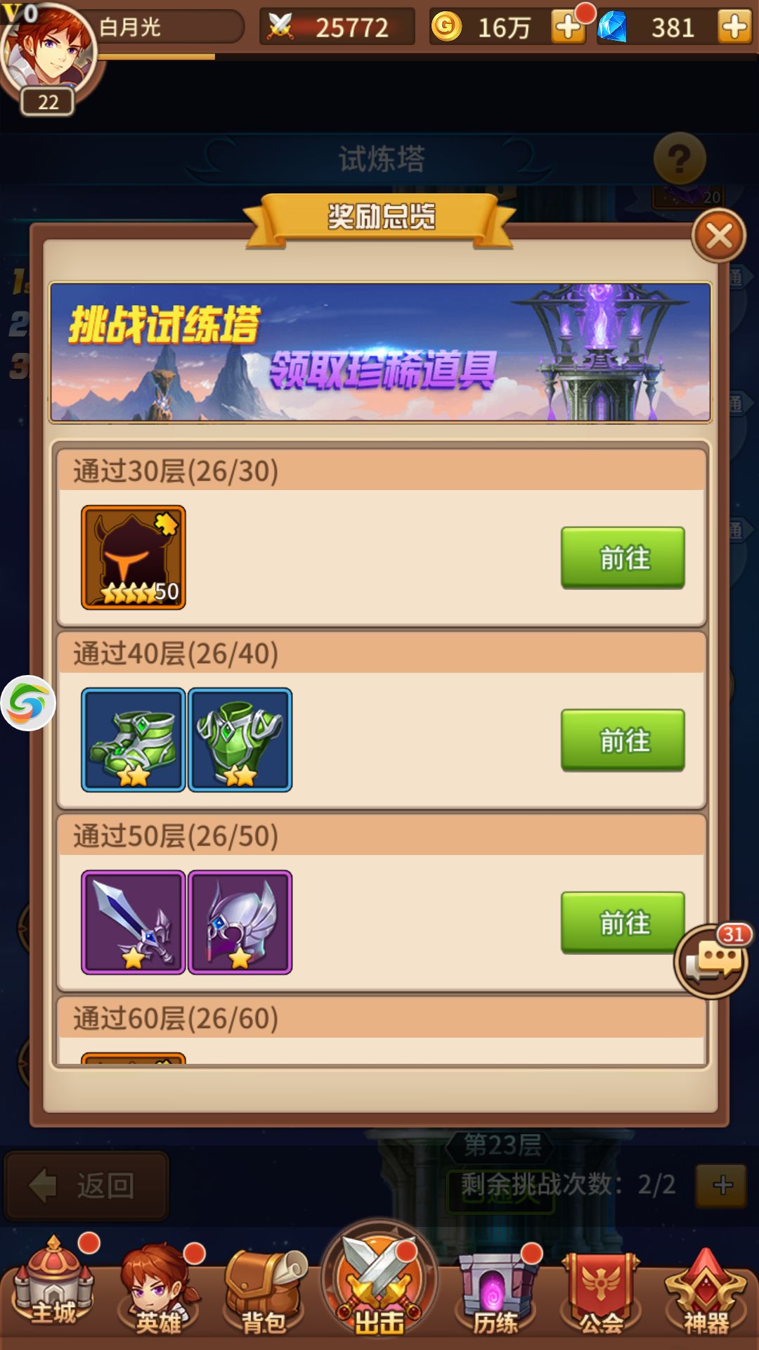 抽完5星以后接着推图,在玩家16级时会开启试炼塔,试炼塔和推图同时进行。图推到75可以在通关奖励那里领取到随机5星英雄碎片,试炼塔打过30层同理