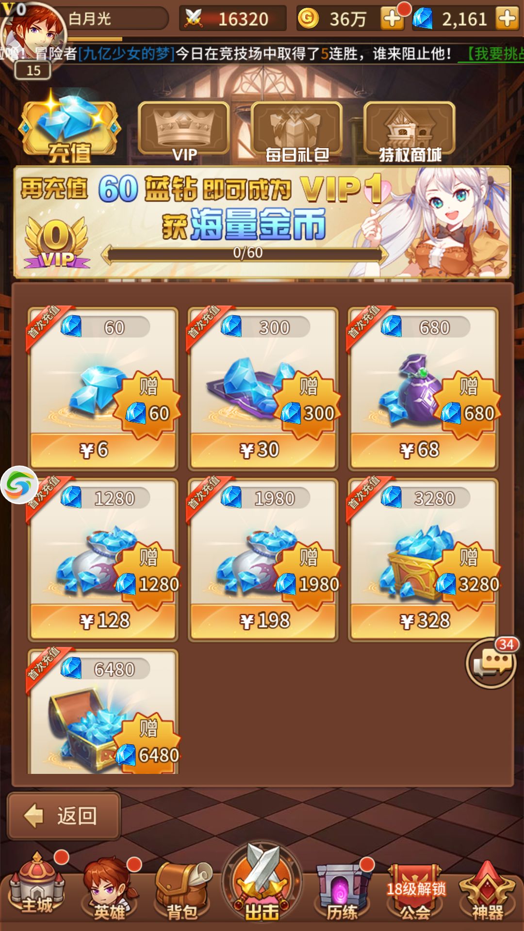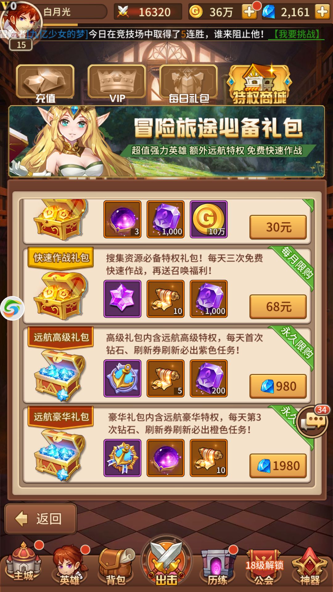 因为每升5级有500钻石所以在15级的时候玩家就会有第一次10连的资本(๑• . •๑),但是千万别直接买10连,你可以在游戏主界面点充值特权买下1980的特权礼包