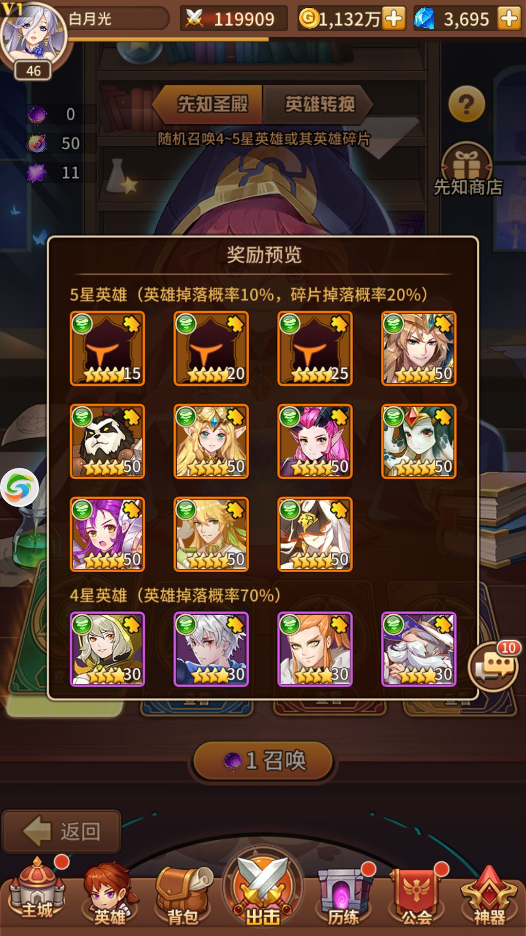 抽一次需要一颗先知水晶,百分之10的5星英雄掉率,百分之20的碎片掉率和百分之70的4星英雄掉率,每次抽奖不管抽中什么都必会得到先知精华和先知结晶。
