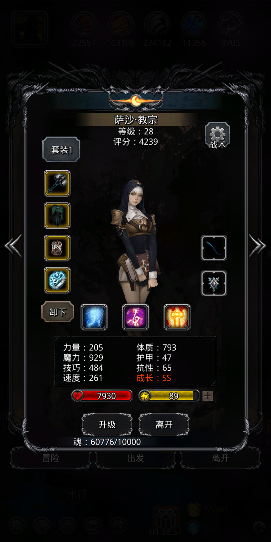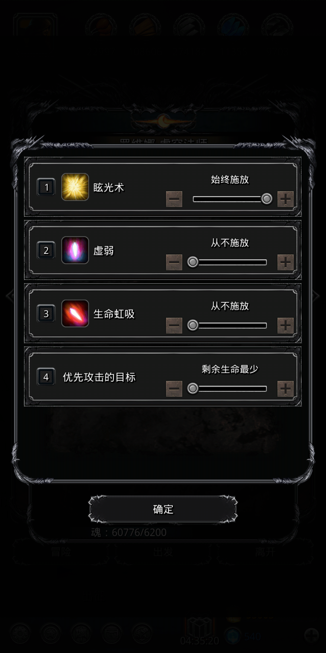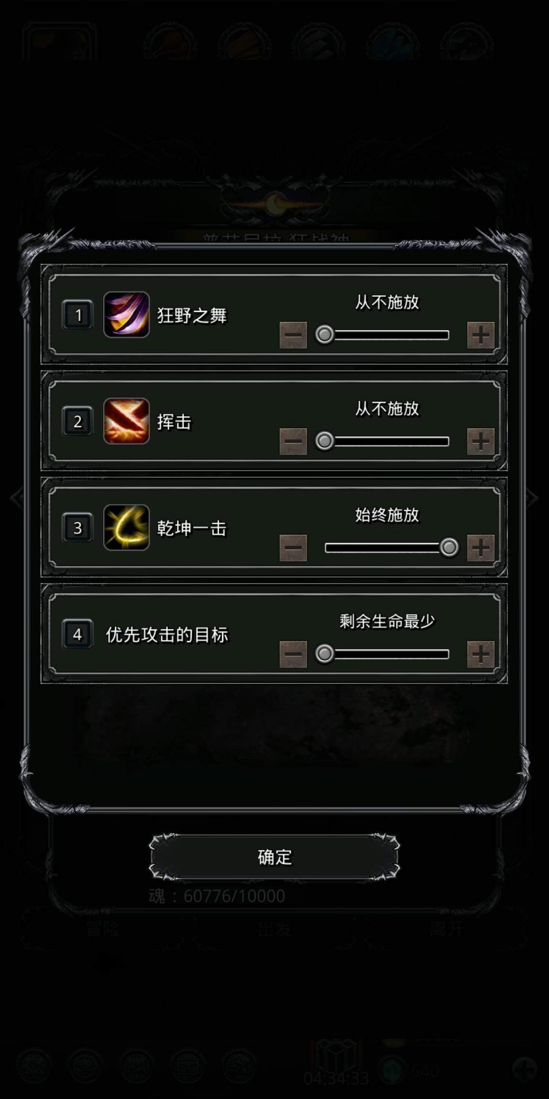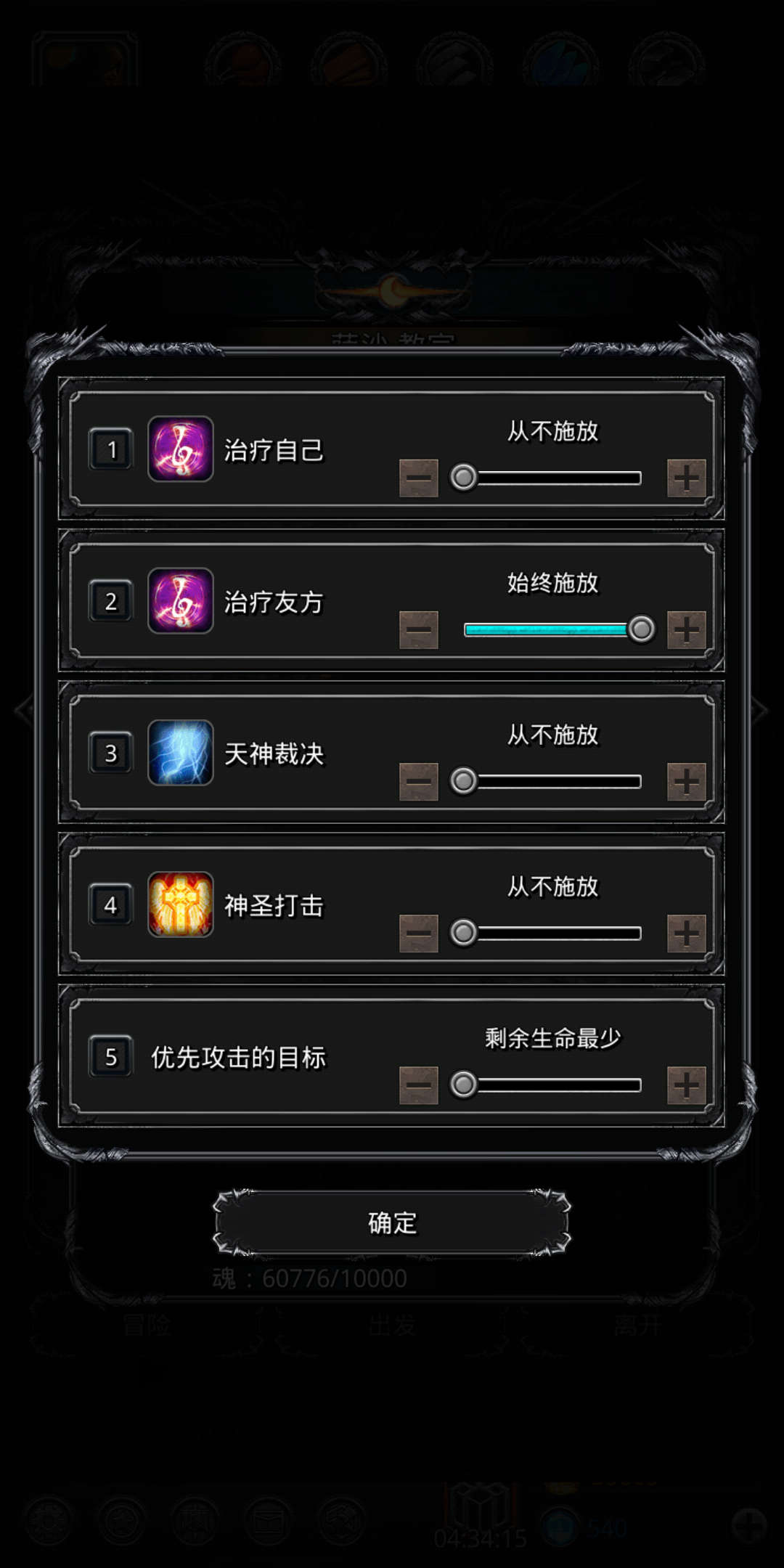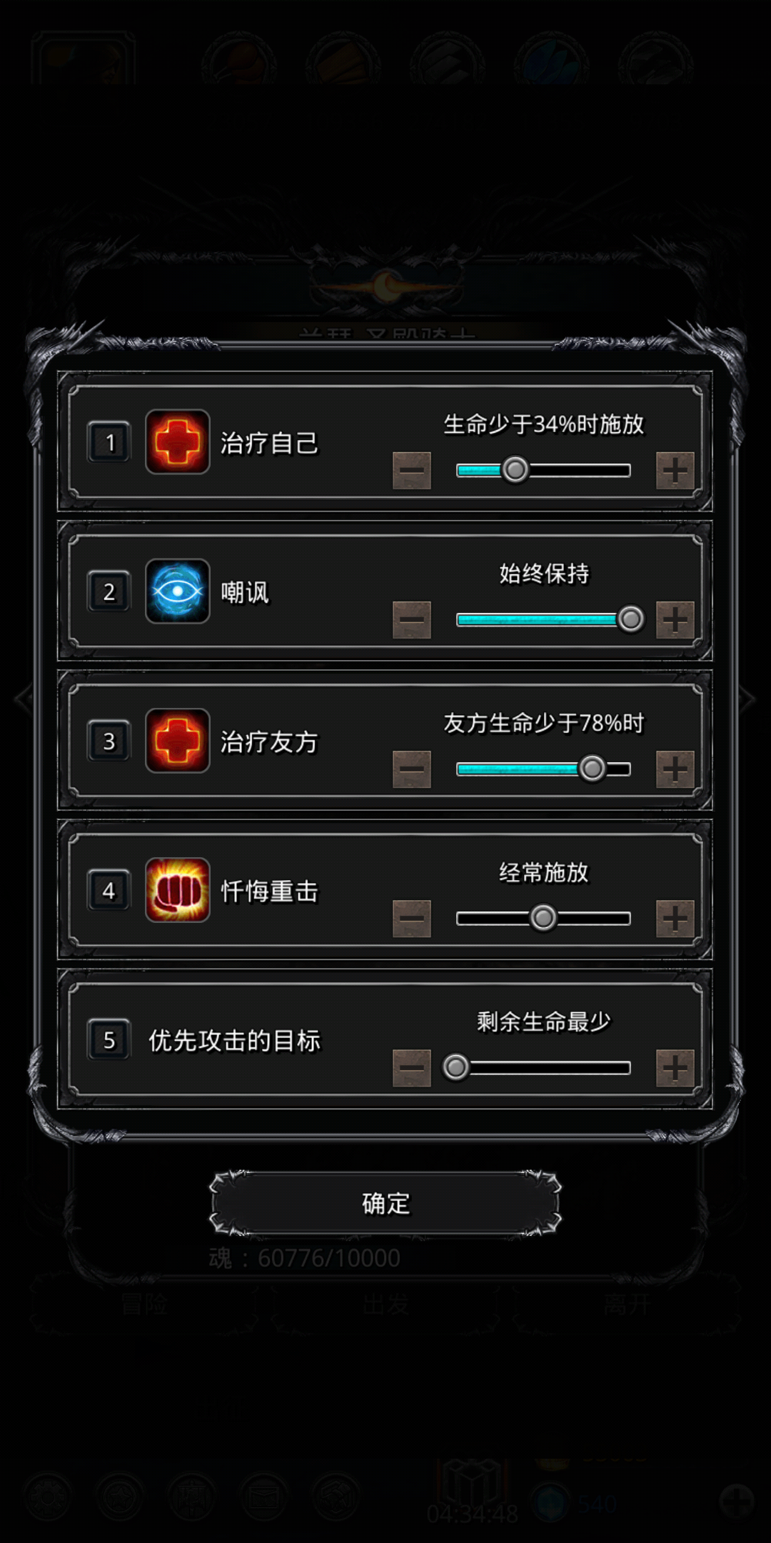 这个怪就是低属性杀手,网上攻略基本都是属性加套路碾压,还要手点中间两个怪是真的麻烦,楼主按照网上攻略团灭了四十多次都没过,这个阵容没啥好说的,清完小怪后如果输出只剩虚空可以把挂机技能换成肾虚,打的快一点,破甲枪哪怕破甲上了状态也秒不死人了,圣骑奶自己可以调高到60,如果输出剩狂战或者全员都在那打的更快,楼主装备平均锻造等级在40左右,人物等级在月30左右,着急过图的可以试试这个阵容