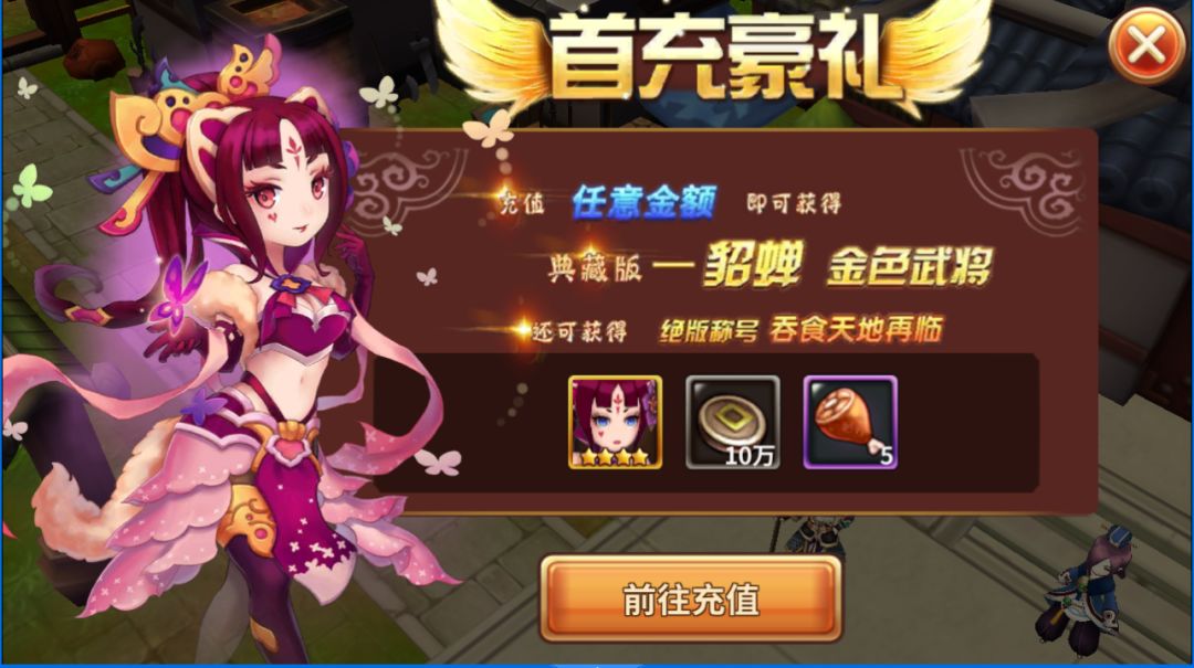 首充是比较推荐的,而且这测试版本并没有6元的首充“最低消费”。也就是说,即使你只是买了1元的“加官进爵福袋包”,也可以获得首充奖励。一元购貂蝉可以说性价比是超高的,在目前的游戏中算得上是数一数二的辅助角色。天生技的集体攻击力加成可以弥补前期伤害上的不足。