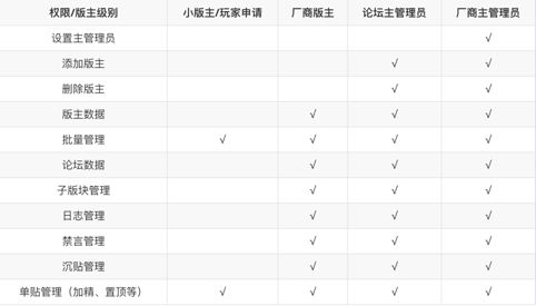 厂商版主权限与之前相同,仅取消添加版主的权限,而小版主则 只拥有帖子处理的普通权限。两个选择便于厂商主管理员及论坛主管理员,对版主权限的划分,具体权限分布见下图