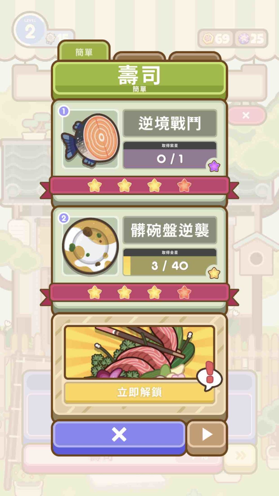 本已经全部寿司简单 紫星的关卡任务做完…等级8级砧板2级~兴高采烈的我匹配了3把线上,突然发现给的道具不算数不见了…故重新登陆瞬间泪流满面,佩服得五体投地。。。