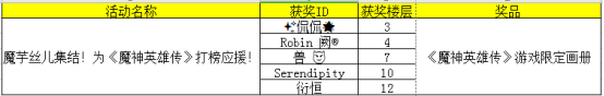 看到了前来支持打榜应援的有很多熟悉的ID也有很多新朋友,我们为大家准备了5份《魔神英雄传》限定画册,以下就是本期活动的获奖玩家名单: