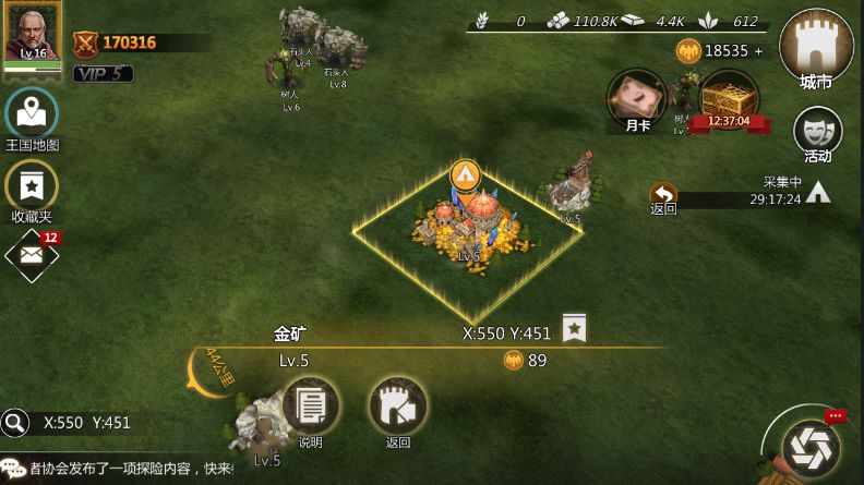 最后玩家在采集金矿的时候不要选择多么强力的队伍,金矿一般不会被掠夺,所以玩家只要派出冲车这一类负重高的队伍就可以了,这样可以让我们留有强力的队伍保护自身的城池。在击杀部队活动的时候,将部队远远的派出去采集金矿也未尝不是一个保护自己的好手段。