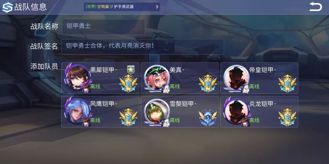 黑犀铠甲:大家好,我叫冷风,时空召唤的老玩家了。当时心血来潮创了铠甲勇士这个队伍,队伍队友是由公会铠甲勇士和二区公会清幽阁组建,大家从S10一起玩到了现在。