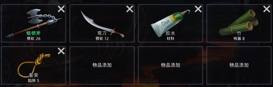 入夜的刀台路线一般是先做两个锁链斧,然后去捡竹子和弯刀。竹子是到处都有的,而山道、墓园很容易被堵,而且经常夜里关闭。根据自己的格子和禁区决定材料顺序。我一般是两个锁链斧,两个弯刀,一个竹子去摸套索,摸两组套索,然后去摸3个胶水。两个胶水合成两个刀台,剩下一个胶水和套索合成陷阱做燃烧炸弹,做不出来也可以直接放,伤害蛮高的。顺的话做出燃烧陷阱,三图四个人也不怕了。