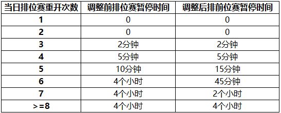 我们重新梳理了排位赛重开的相关数据,针对重开后暂停排位赛的时间进行了调整优化,让规则更加的合理,降低对部分玩家的影响,具体规则如下: