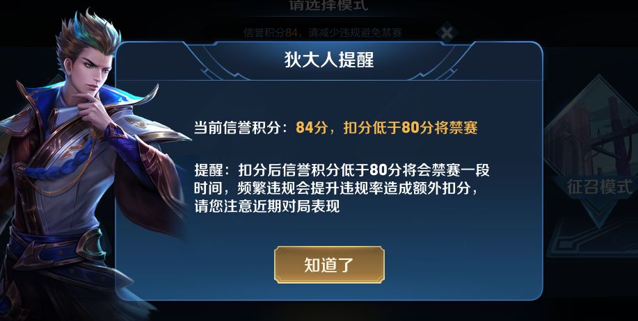 当您的信誉积分即将低于80分(扣分后低于80分将被禁赛)时,进入对战模式还会弹出提醒框,告知信誉积分处于一个非常危险的边缘,请注意之后的相关对局表现。
