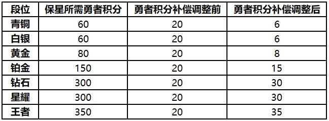 我们认真听取的这个建议,重新梳理了勇者积分补偿的规则,将规则调整为:根据受影响召唤师的段位进行勇者积分的补偿,补偿额为当前段位掉星保护所需要勇者积分的10%,详细补偿规则如下: