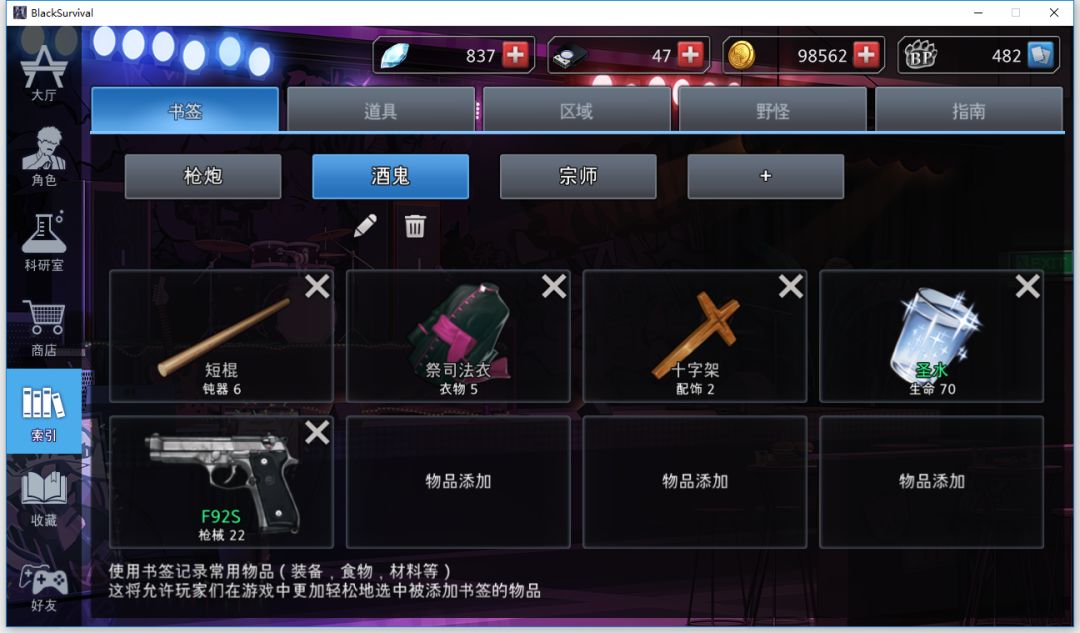 教堂:1短棍1法衣1十字架2f92s,圣水有就拿没有就算,摸到圣杯就顺手做个圣十字架(圣水圣杯不强求),f92s瞬放一把带一把,如果摸到北枪,可以顺手做把南北枪走(摸到北枪考虑,无北枪不考虑)。这里不做过多解释