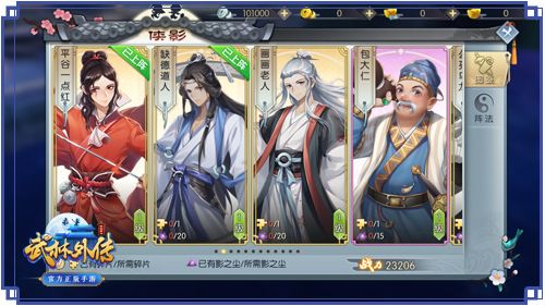 客官可以同时上阵6个侠影,每个侠影均有4个情缘,当上阵的侠影中有对应的情缘侠影,就将激活情缘属性。此外,上阵的侠影全部达到1级、3级等,还可获得阵法属性加成。