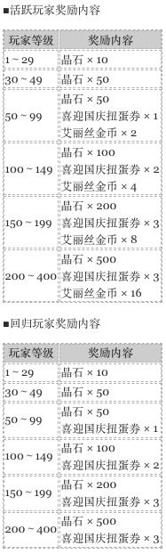 十一国庆节长假即将来临,我们将会在长假期间推出等级奖励活动!在9月24日2时~10月1日2时之间未登陆过游戏的玩家,在10月1日2时~10月8日2时登陆游戏,将可获得等级奖励!奖励包括丰富晶石以及可抽取粉碎祭典限定角色的“喜迎国庆扭蛋券”,等级越高,奖励越丰富哦!当然,在此期间登陆过游戏的活跃玩家更可以获得额外奖励“艾丽丝金币”!