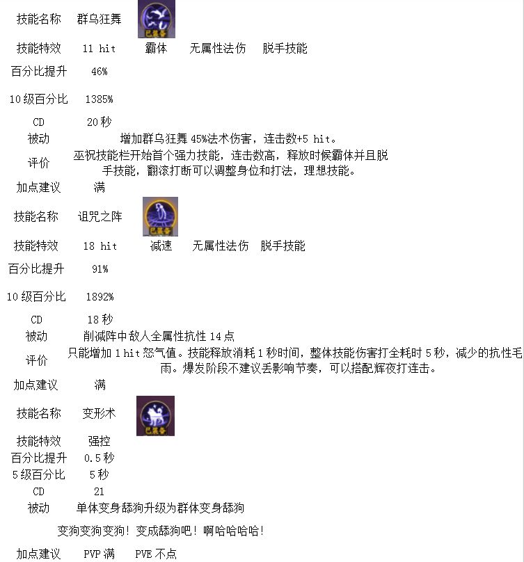 对于现阶段的巫祝来说,选择巫祝这个职业,就要先给自己一个合理的定位,这个职业,没有最爆炸的伤害,技能形态磨叽,抢DPS也不是最漂亮的,装逼逼格不高,反而辅助能力不错,团队能力优秀。听说巫祝职业要优化了,希望我写这的篇百科,马上就要迎来改版。