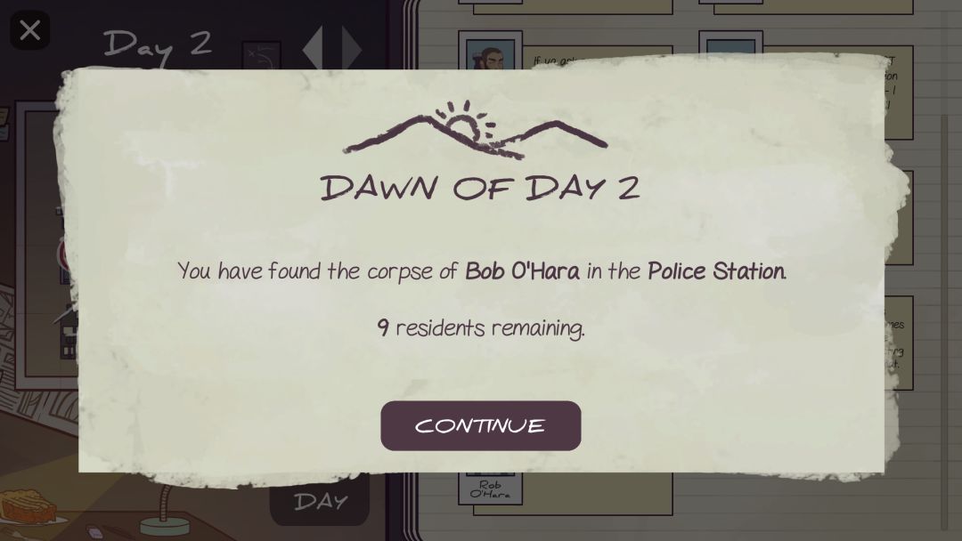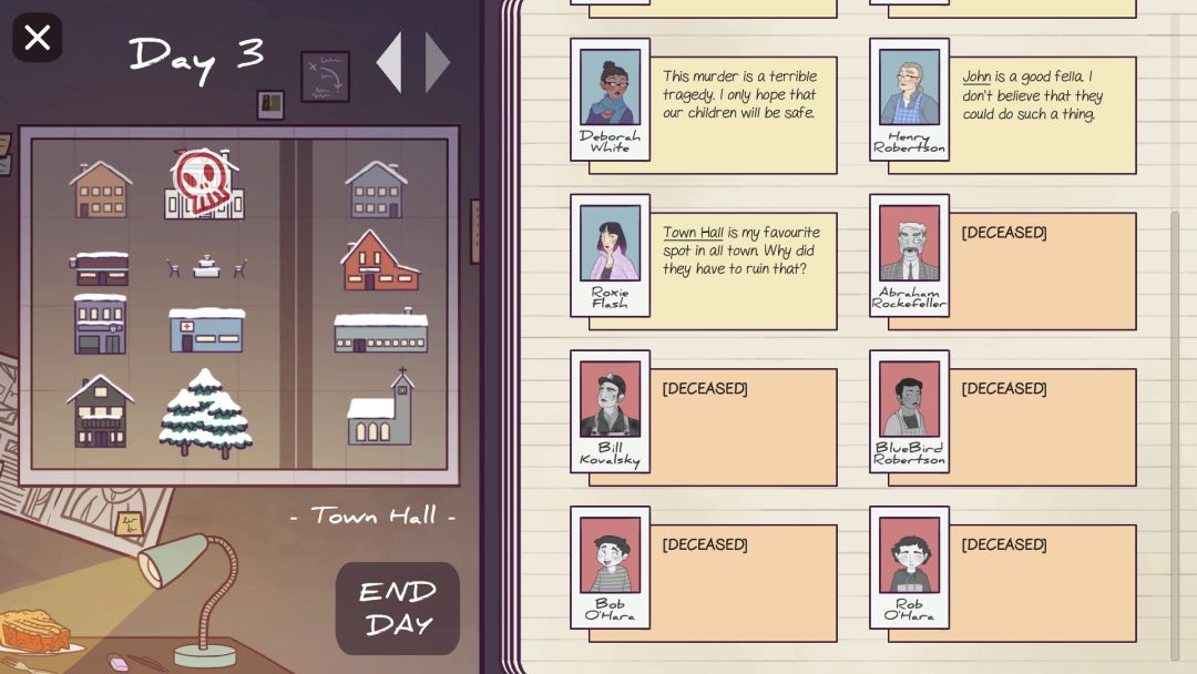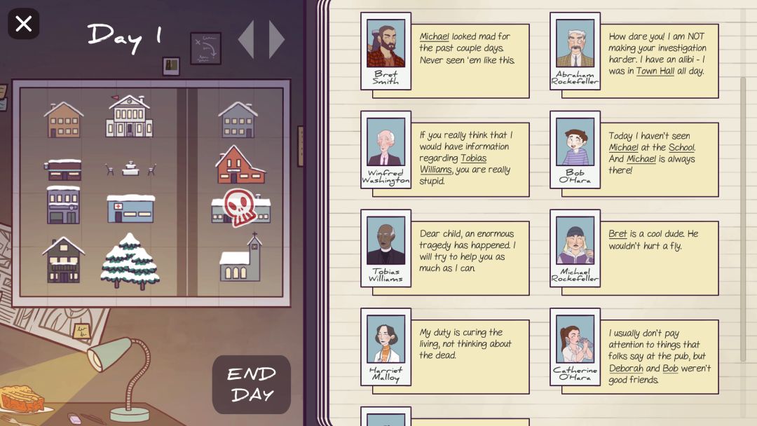 在一个与世隔绝的小镇里发生了一系列杀人事件,你需要通过与当地人对话来收集线索,找出背后真正的凶手。到底是谁在说谎?每天晚上谁又该被牺牲?游戏为Ludum Dare 43参赛作品,这次的制作主题是“必要的牺牲(Sacrifices Must Be Done)”。
