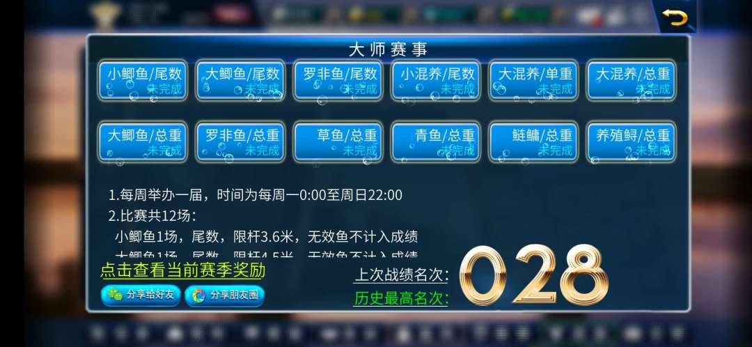 同样,在《垂钓宗师》了,我们也设置了这样的高端比赛,只要自己觉得有实力的玩家,都可以参加大师赛事。大师赛不但有日常赛程,还有季度赛和年度钓王赛,详细规则如下: