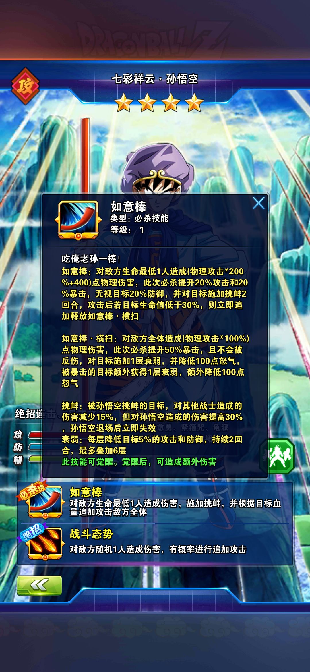然后在来看必杀技 20%攻击20%暴击率 无视20%,暴击高,生命中低于30%追加一个全体伤害,一打一个准,