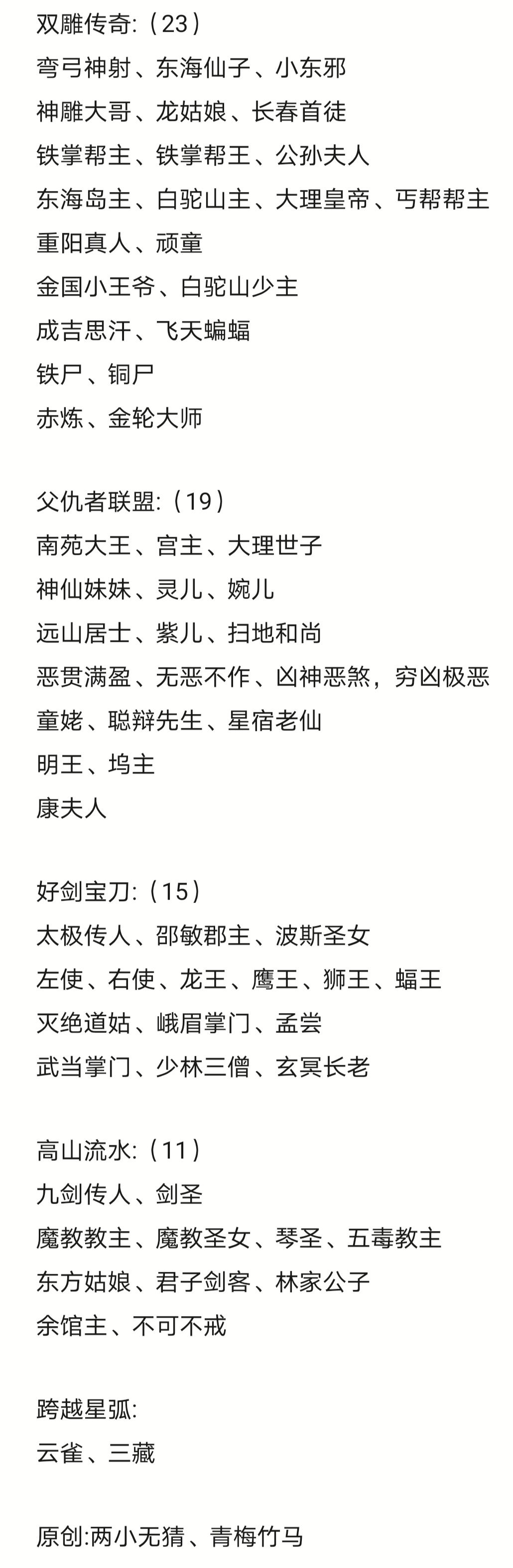 【武侠归类】个人分类,与游戏内容无关,与游戏设定无关,与武侠背景无关,不涉及版权问题,请勿无端联想,个人行为与游戏无关。