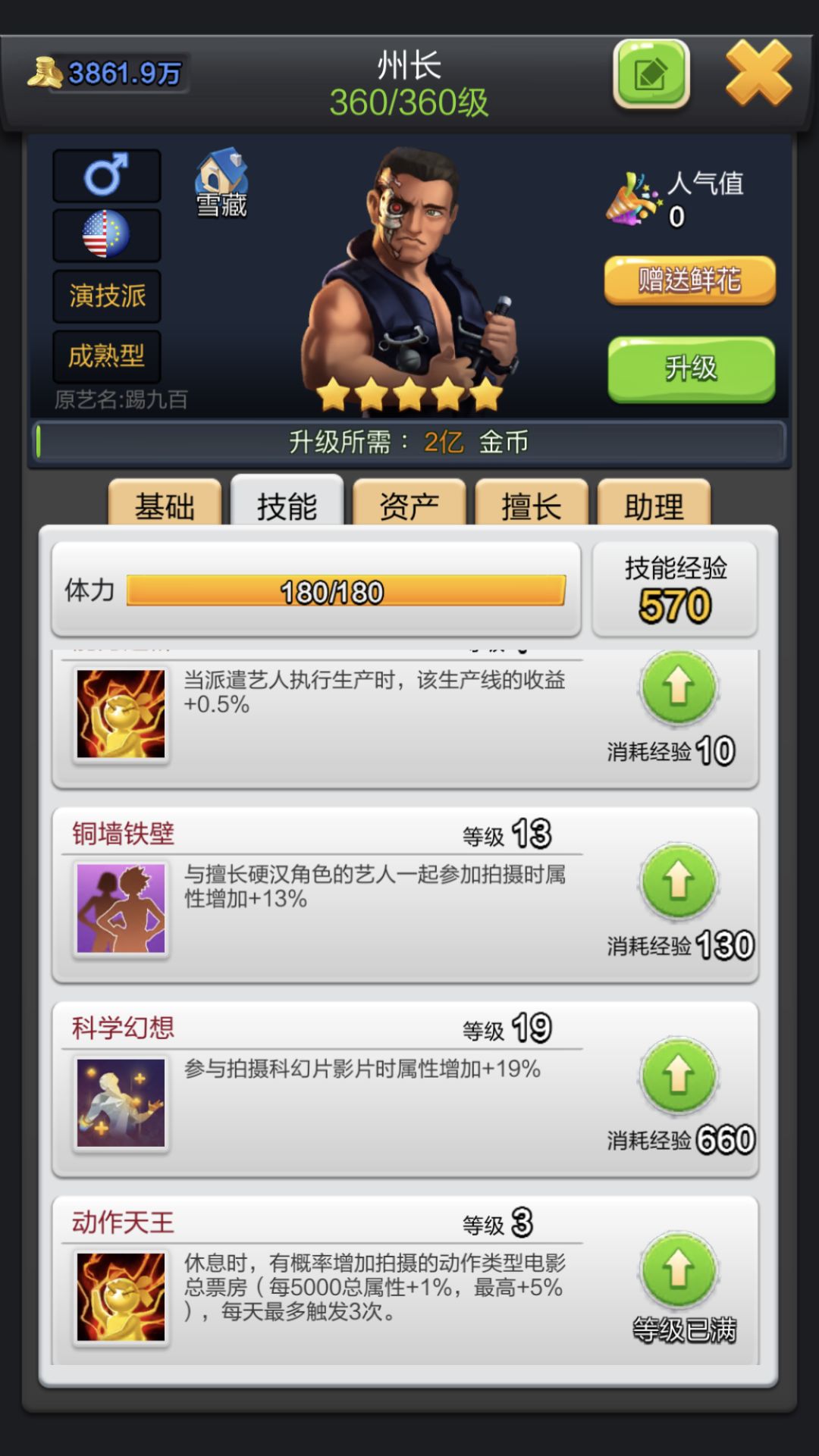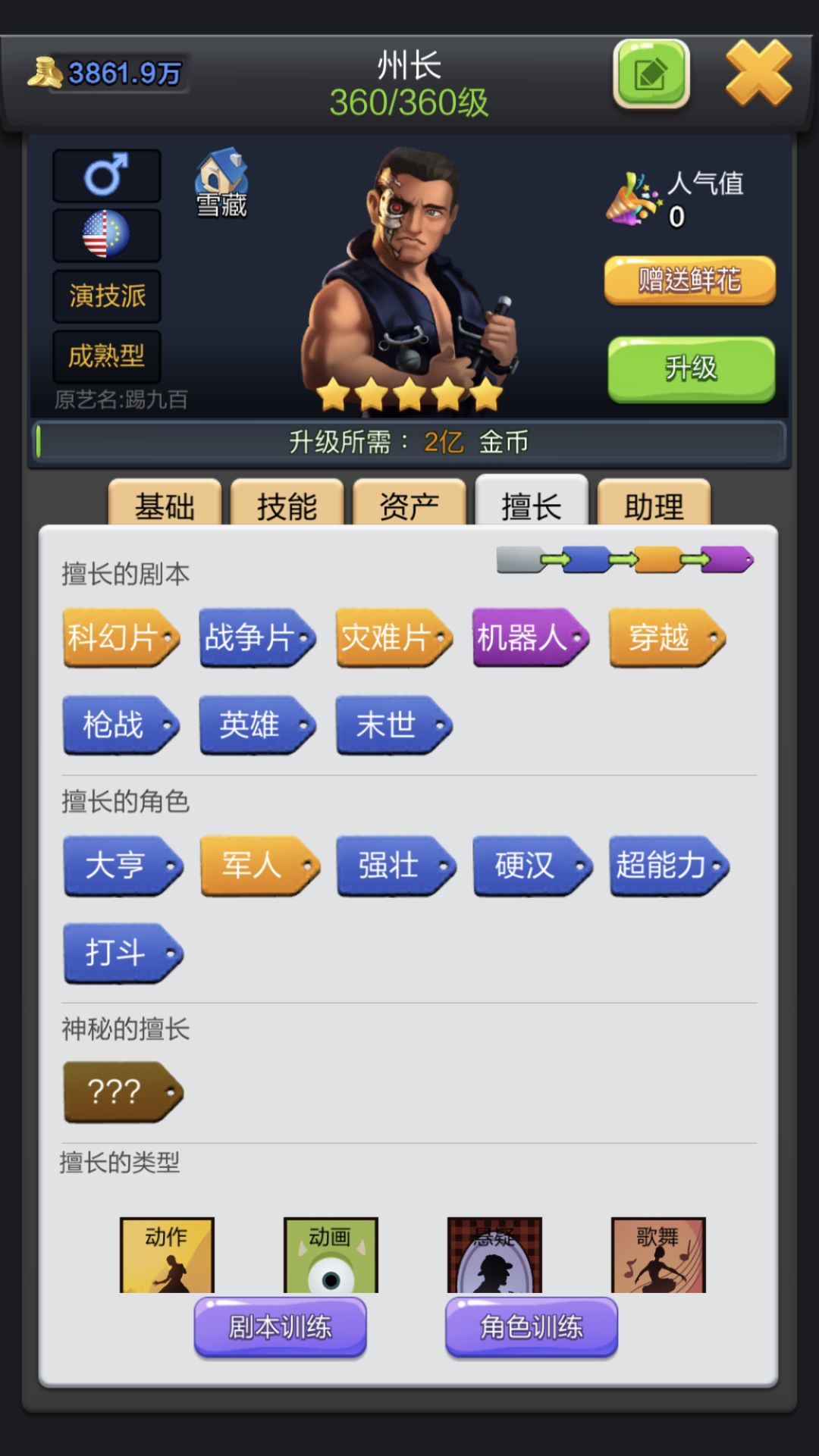 就算你不想使用他拍摄也要把他的总属性堆到两万五,因为每五千触发1%,并且5%封顶。想想拍摄动作片的时候差一点超卖或者传奇,被T900踢一脚还是很舒服的。
