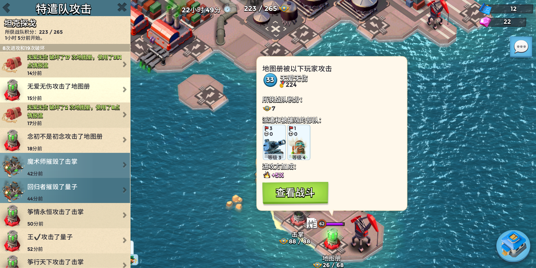 先来看看他都干了什么好事情,30多级,只派3条船打任务,还是光吃电池不打防御建筑的,没错,他就把图上7个电池打掉了。以队里的实力完全可以打掉这张图,他却在这搞破坏,都30多级了啊!!还不会打任务啊!?400多情报一下子被他用光了!!队规明确规定光打小电池不打防御建筑的立刻踢,他这理解我给满分。不看描述就进队!!我们队里攒的情报都是用来请外援的,也就请外援偶尔留下的图会碰碰运气,看看能不能把关键的火箭震爆之类的爆掉,从未超过用9点情报破坏的。此人上星期入队,期间未曾打过任务,在队期间,队里请过几次外援,因其打够35情报给了军官,结果今天突然把情报用光。不说什么了,懂得都懂,深恶痛绝这种人。从此不加Q群不给官。