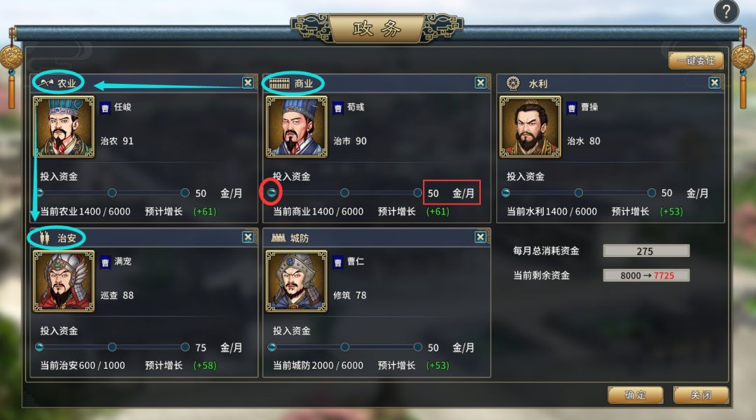 政务是策略游戏势力发展的基础,建议早期只对最重要的商业【决定金钱收入】,农业【决定粮食收入】,治安【决定城市治安度,低了容易暴动!】这三项进行投入,安排武将的能力顺序也是商业,农业,治安优先,同时量力而行,用默认的最低档投资额,这个档次的投入产出性价比是最高的。早期金钱就捉襟见肘,全面开花或者拉到中高档位投入都有浪费金钱之嫌,性价比低。因为早期玩家少有治水能力和建筑能力80以上的武将,能力过低不建议进行投放。