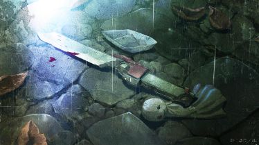有关照片的暗示,沾染血迹的刀代表着人类发起的战争以及死去的人,纸船代表着战舰,晴天娃娃则像被害者一样被压在刀下,暗示着被误伤的人类。