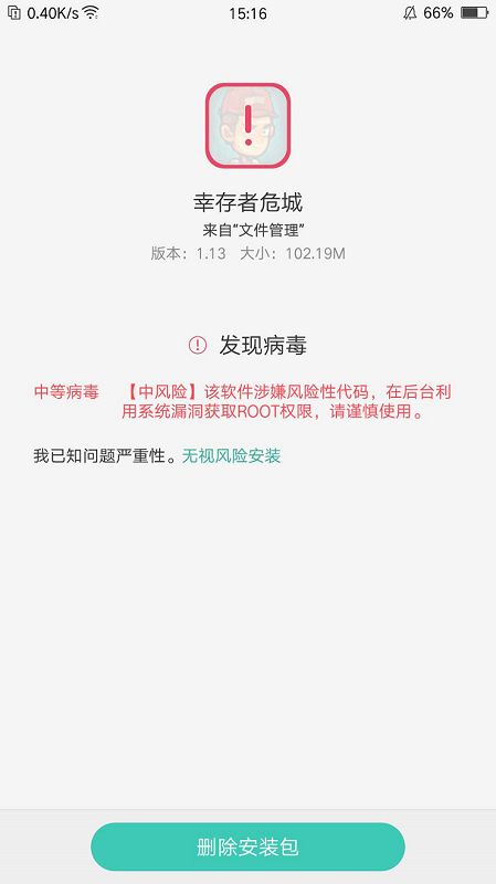 各位村民大家晚饭好,不晚上好。据说最近有苟延残喘,饿到前胸贴后背的幸存者遇到了如下的类似问题,在安装时候提示发现病毒(硬核手机有出现)。在经过验证时发现应该与广告方面有关,即日将会替换一个同版本的包解决这个问题。如有出现类似情况的玩家重新下载并安装即可,你的信任就是对我们的支持。