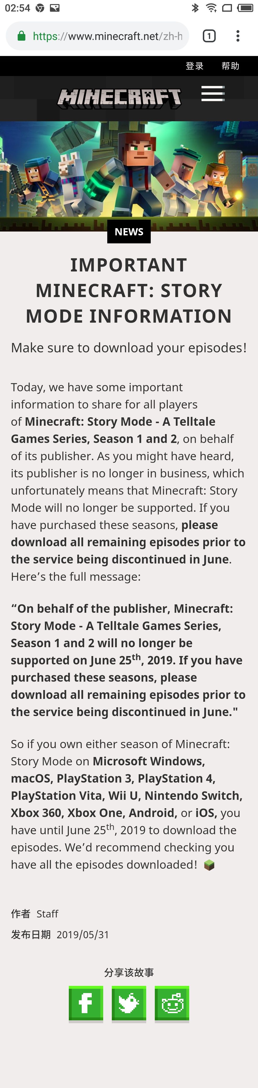 “代表出版商,Minecraft:故事模式 - Telltale游戏系列,第1季和第2季将不再在2019年6月25日后被支持。如果您购买了这两季,请在六月服务停止前下载所有剩余的章节。”