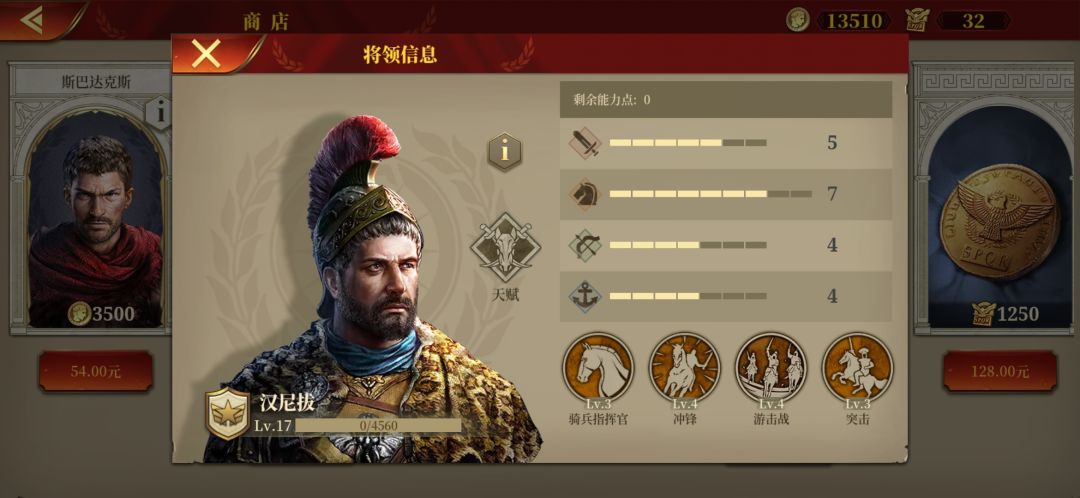 特别:氪金的三个将都过分强大。不推荐购买。觉得游戏难度过大可以选择购买,三位战斗力提升完全等效。只要步兵团跟着斯巴达克斯。射手团跟着凯撒。骑兵团跟着汉尼拔。战斗力就能最大化。