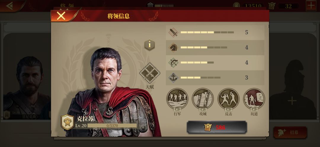 5 步兵之王,克拉苏。推荐理由:步兵有两个思路,一个是非常能抗,通过步兵被动技能反击打出大量伤害。另一个是攻城快,步兵防御力高,血量高,站在主城门口,通过一回合主动一回合被动拿下城。主要推荐第二个思路,因为步兵攻城最快,所以克拉苏排第一位,为什么不是指挥官,因为战士的意志就是干架,我的指挥官都要拿去锤架。