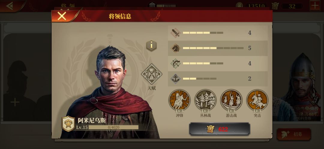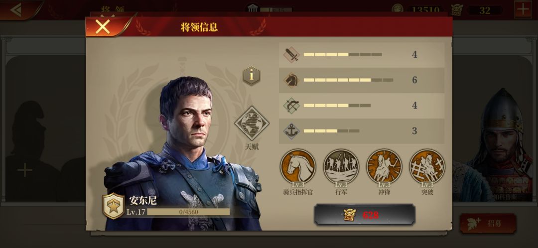 3 骑兵老二,阿米尼乌斯。推荐理由:发展潜力大。换血能力骑兵最强(能打能抗)。但是缺陷在于缺少骑兵指挥官,不能快速占城,快速斩杀。安东尼有,但是安东尼被动地理,技能突破、行军都对战斗帮助甚少,所以游戏上不如阿米尼乌斯,建议首选阿米尼。