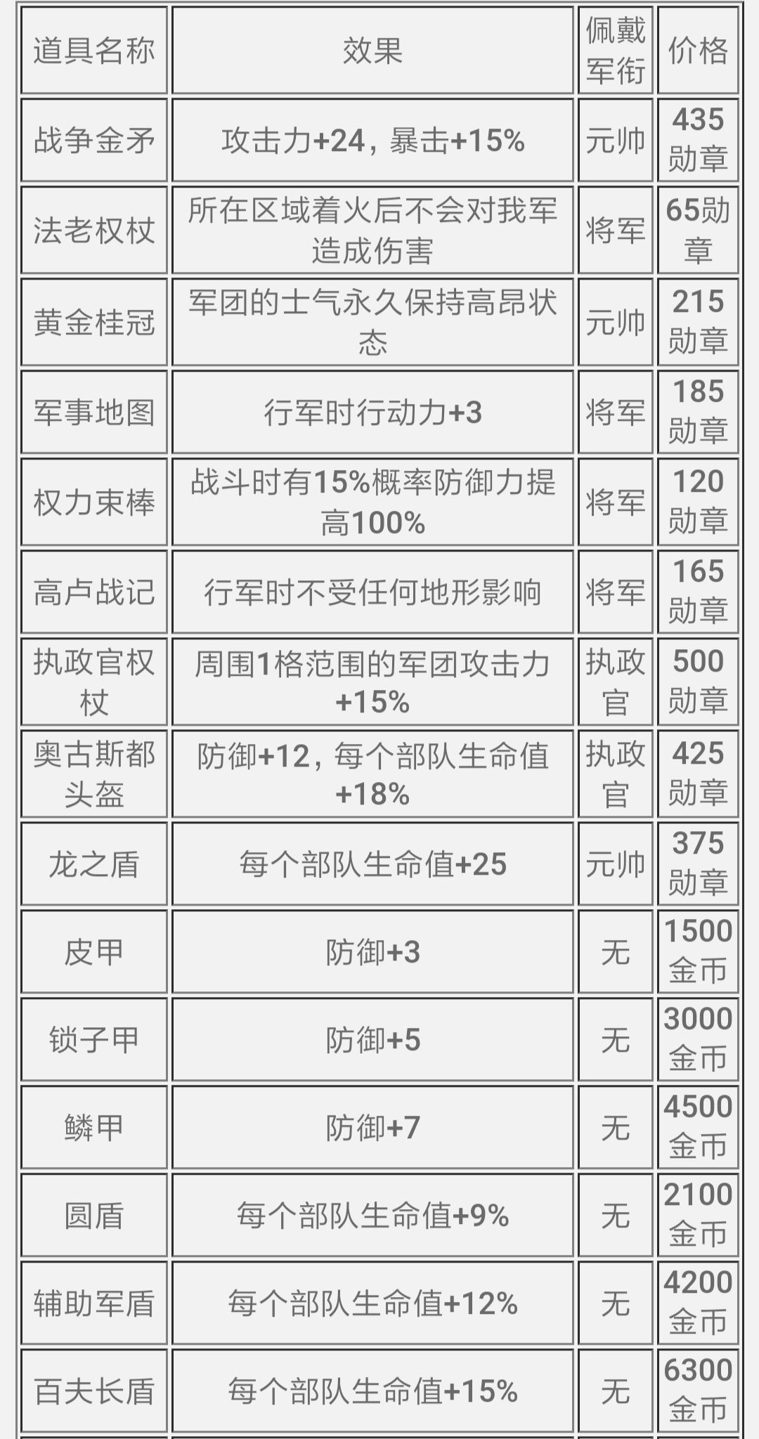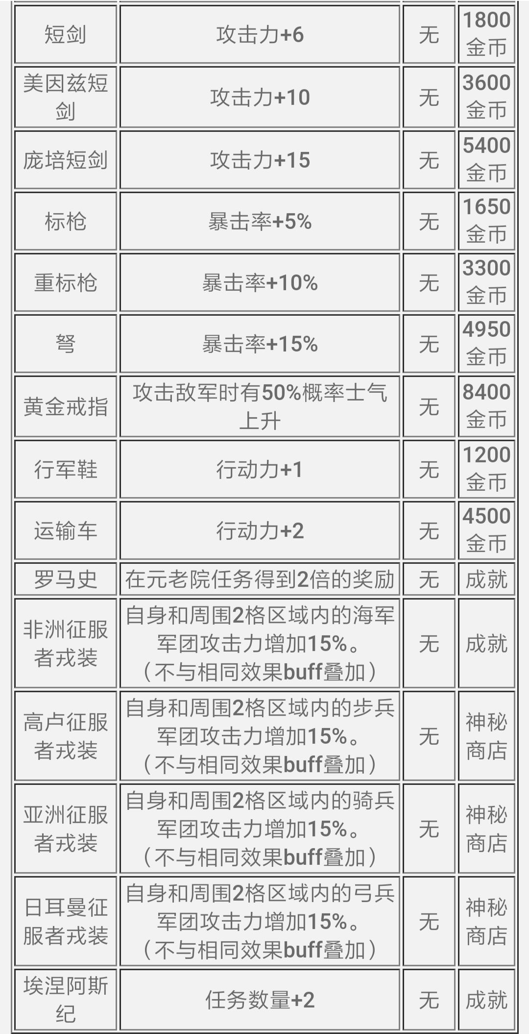 特别说明。加攻击力的装备适合低级兵种,低兵量作战也就是不能很好的补充兵力的时候,防御力同理。不推荐买加攻击力的所有金币装备。(射手)要加输出推荐买弩:增加百分之十五暴击率。步兵推荐百夫长盾。骑兵推荐百夫长盾。