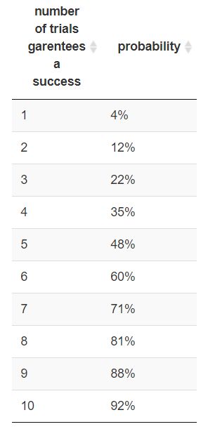 由于每次失败之后成功率都会提高4%,那么一直连续失败若干次才成功的概率是多少呢?算起来比较简单,结果与大家分享下