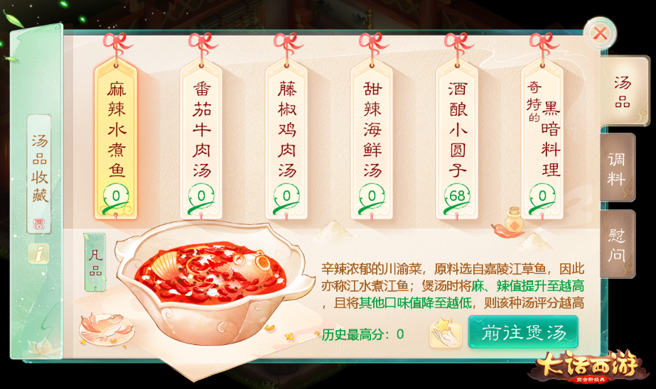 在煲汤完成后,系统将对玩家做出的汤品进行评分,究竟是美味佳肴还是黑暗料理,就得看大家的厨艺天分了!每日第一次煲汤可获得经验以及物品奖励,煲汤的评分还将记录进“汤品收藏”栏,大家可以多次挑战煲汤游戏,磨练自己的手艺!
